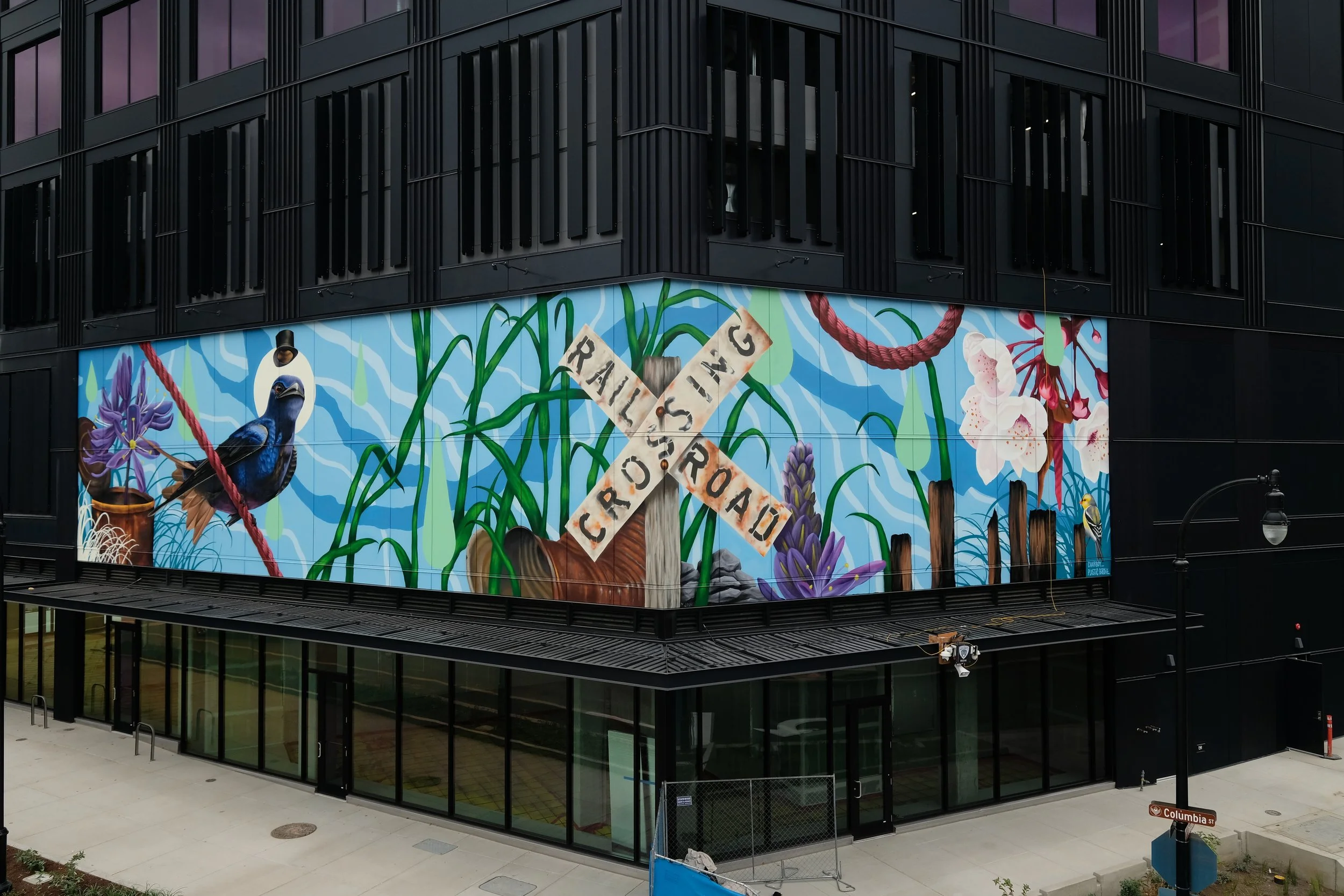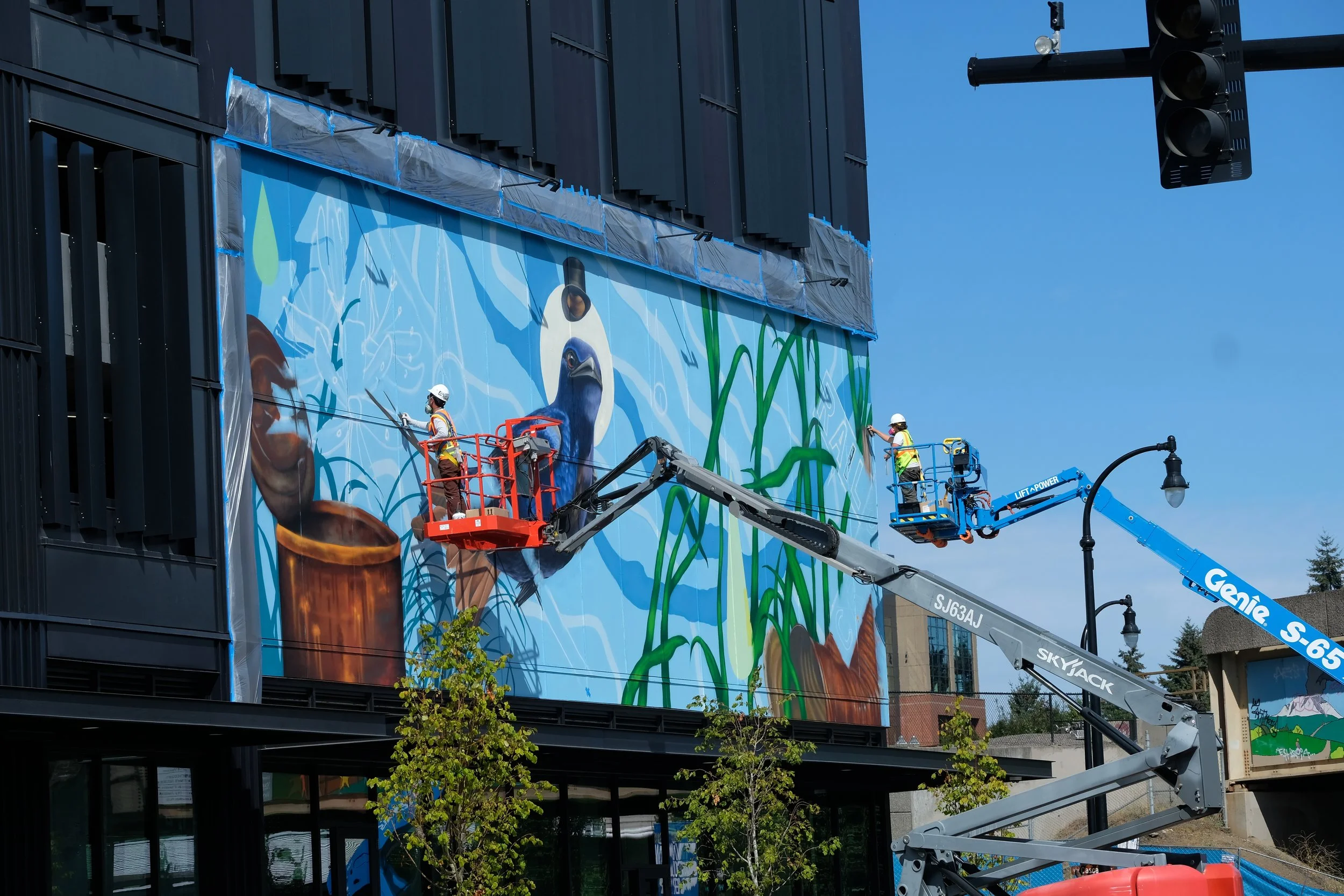 This mural was painted with Hyden Senter (Chairboy) at Terminal 1 in Vancouver Wa. We wanted to create a mural that grabs the viewers attention, sparks curiosity, and brings the community together to start a conversation. We went into this knowing that our imagery needed to represent the area's history, culture, geography, nature, industry, and growth. The mural needed to be able to tell stories in a subtle manner in order to leave room for people to discover something new.